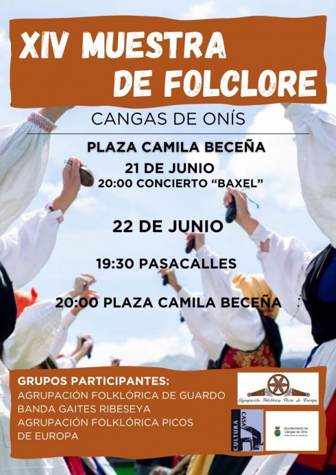Un año más la Agrupación Folclórica Picos de Europa de Cangas de Onís celebra su ya XIV Muestra de Folclore. Será este sábado 22 de Junio en la Carpa instalada en la Plaza Camila Beceña. A las 19:30 comenzará un pasacalles por las principales calles de la ciudad para congregarse y dar comienzo a las 20h. Este año actuaran junto a ellos sus colegas de la Banda Gaites de Ribeseya y el grupo Coros y Danzas de Guardo (Palencia), donde los anfitriones compartieron con ellos escenario el pasado mes de Mayo en el Auditorio municipal de Guardo. El evento estará presentado por Begoña Collado, incondicional ya a este festival.