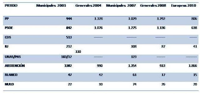 Gráfica comparativa de los resultados de las elecciones en Colunga de los años 2003,2004,2007,2008 y 2009.